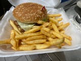 Hamburger, onions, mushrooms, swiss cheese Served with chips or French fries.
