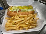 Grilled cheesesteak topped with fresh lettuce, tomato, American Cheese crispy bacon, and creamy mayo. Served hot with French fries and a cold can of soda.